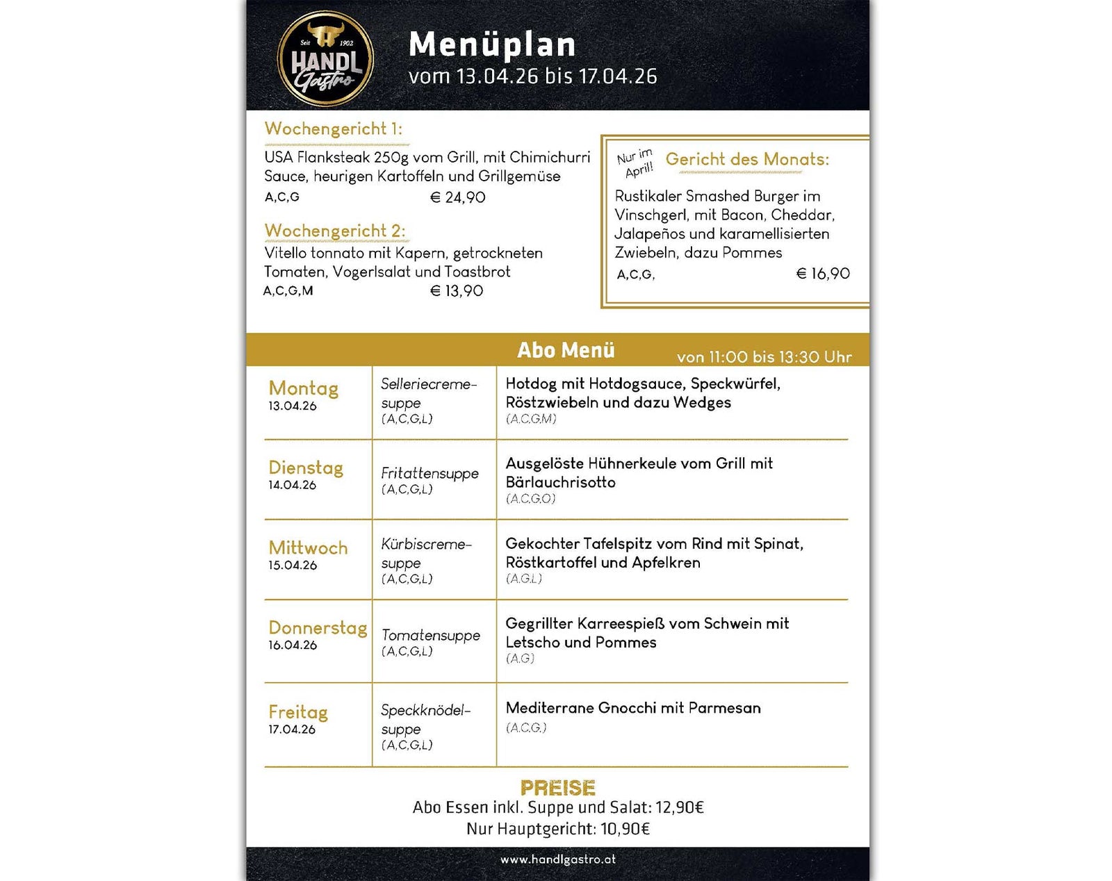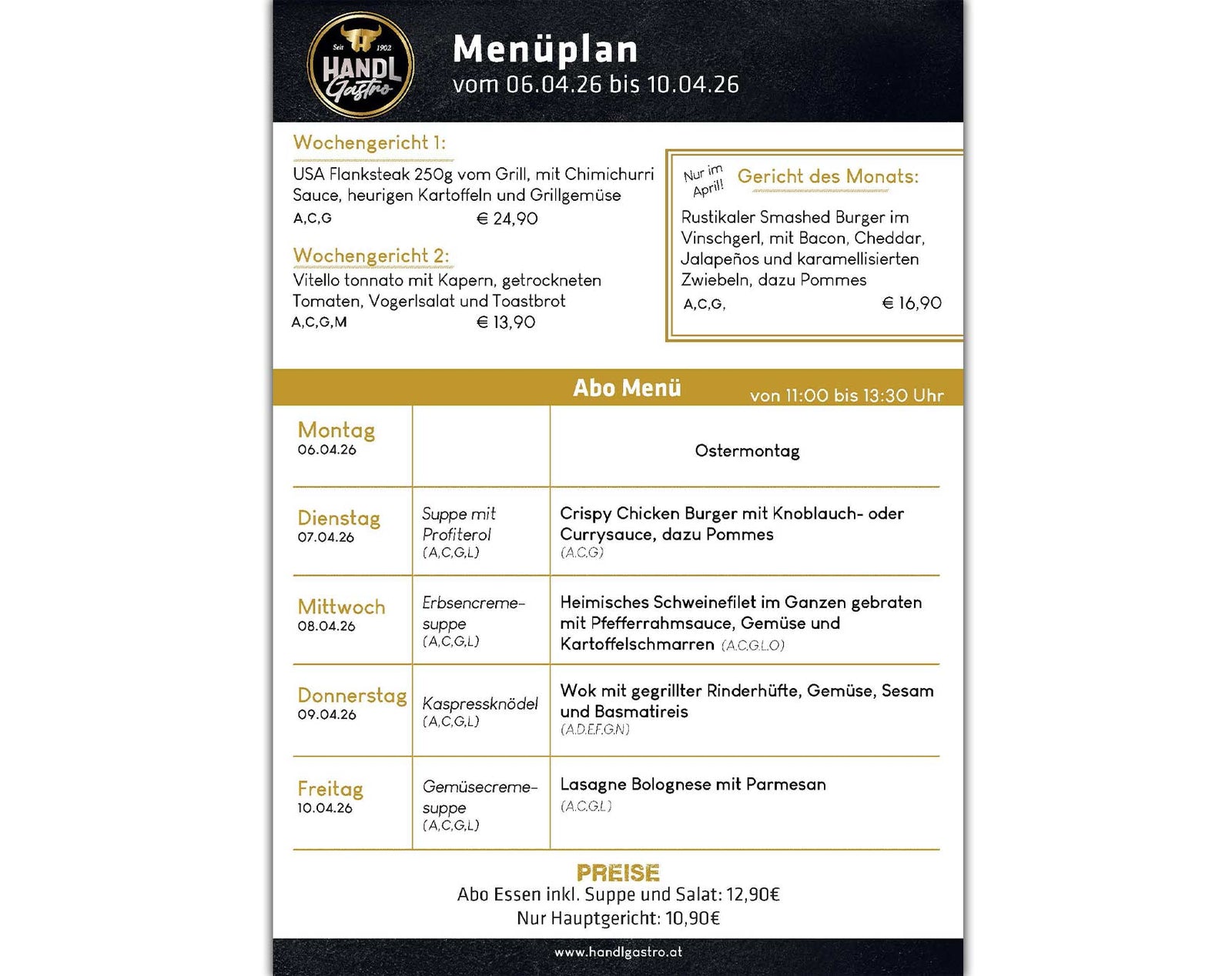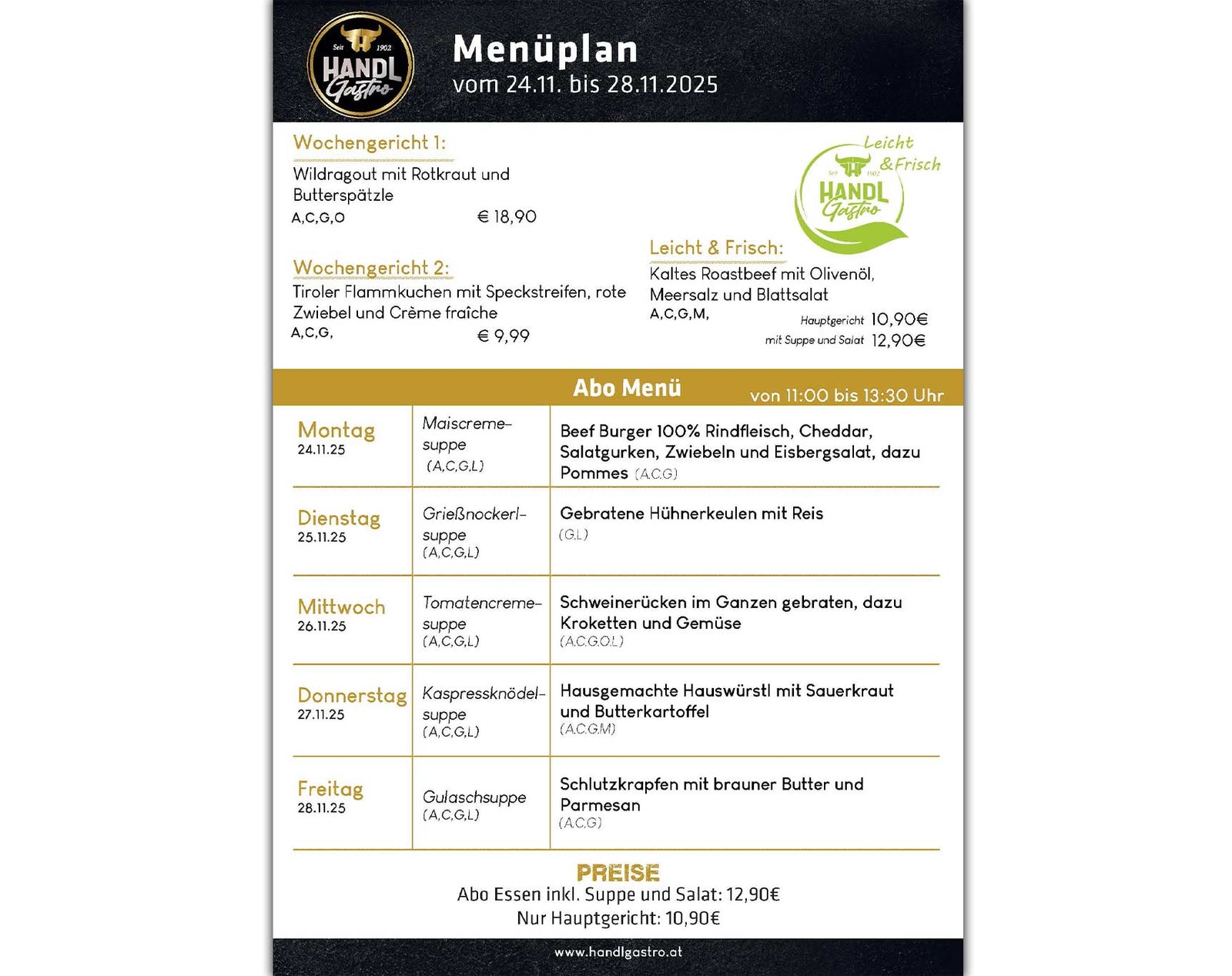 Das Abo Essen bieten wir von 11:00 bis 13:30 Uhr in der Genusswelt in Pians an. Die Wochengerichte 1 und 2 werden alle 2 Wochen gewechselt.